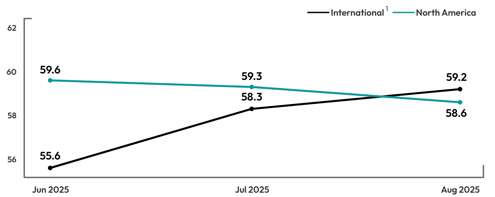 1Due to the small sample, the North American and International indexes are based on a 3-month moving average. The August 2025 index is preliminary, based on the average of July and August 2025 and will be final with September 2025 data in the next report.